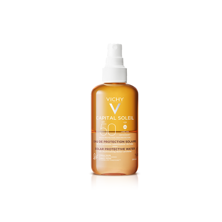 Eau solaire offrant une très haute protection SPF 50 contre les rayons UVA et UVB. Sa texture bi-phasée ultra-légère et rafraîchissante procure une sensation d’eau sur la peau, avec un fini invisible, non gras et non collant. Enrichie en bêta-carotène, elle aide à sublimer et unifier le bronzage tout en protégeant la peau du soleil. Résistante à l’eau et adaptée aux peaux sensibles.